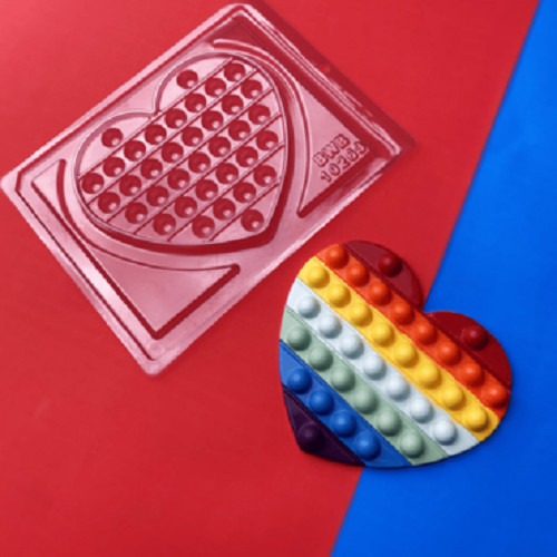 Molde Acetato - Pop It Coração. Com este molde, poderá fazer o seu topo de bolo comestível em chocolate. Um molde em acetato que fará qualquer bolo único e especial, com este molde de coração.