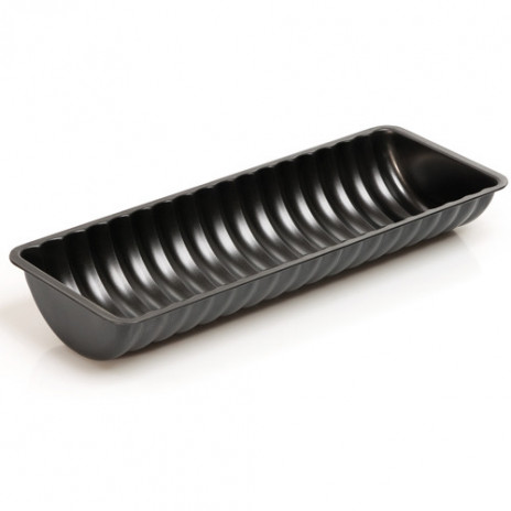 Forma em aço semicircular anti-aderente com marcação de onda no topo do bolo.