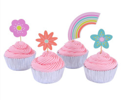 Este conjunto de formas e toppers coloridos e divertidos com flores e arco-iris podem ser usados de várias maneiras para festas, ocasiões especiais em cupcakes ou qualquer tipo de bolo.