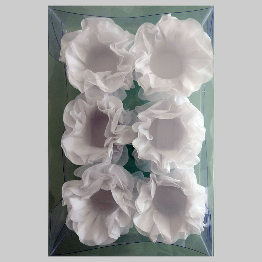 Conjunto de 12 forminhas em papel de seda para brigadeiros ou outros docinhos em forma de flor com pétalas brancas.