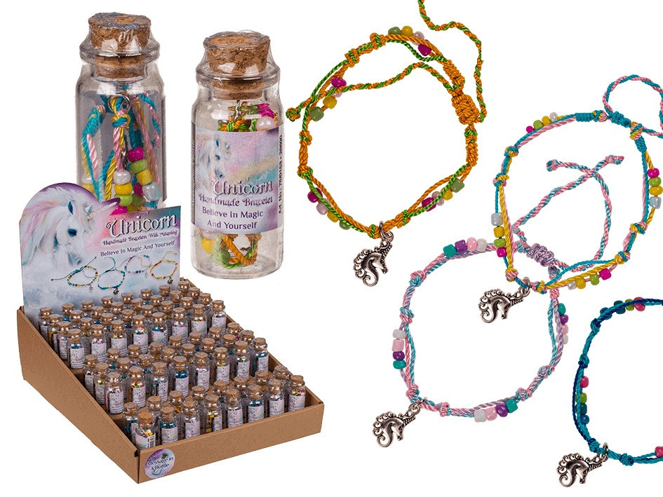 Um presente diferente e original. uma pequena garrafinha, que no seu interior tem um pulseira com missangas, e um pendente unicórnio. pode ser usado em batizados, como um presente, ou como uma lembrança de aniversariantes, casamentos, baptizados, festas no geral, ou como decoração.