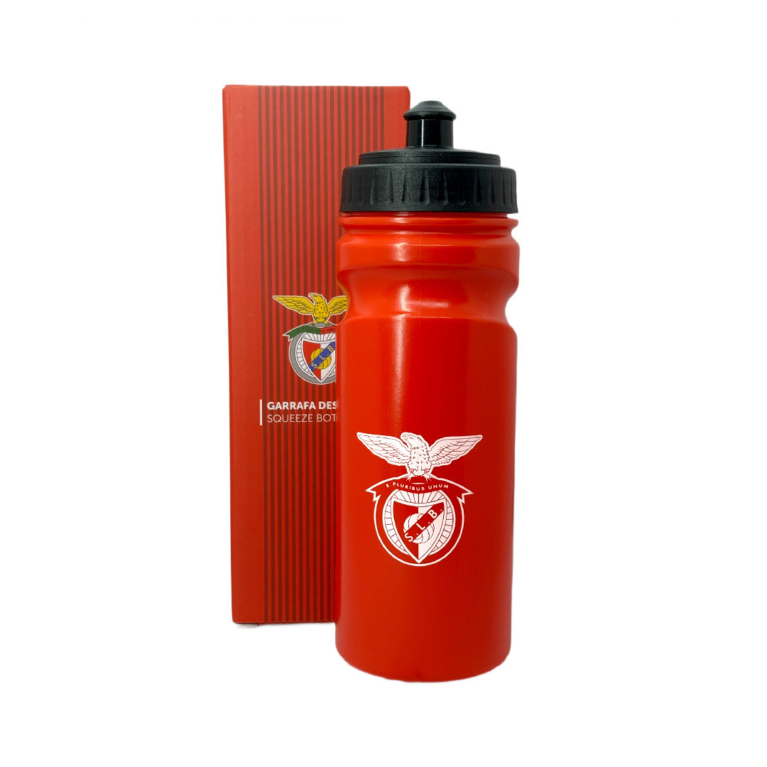 Garrafa de desporto em plástico do Sport Lisboa e Benfica com capacidade para 500ml. Com boquilha em plástico.