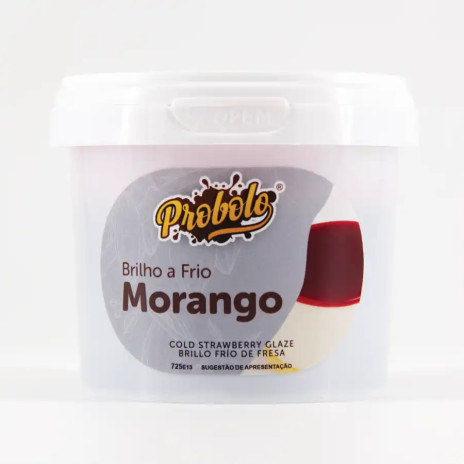 Brilho em gel, com textura suave e cremosa e de aplicação direta a frio em produtos de pastelaria, de cor avermelhada e de sabor a morango.