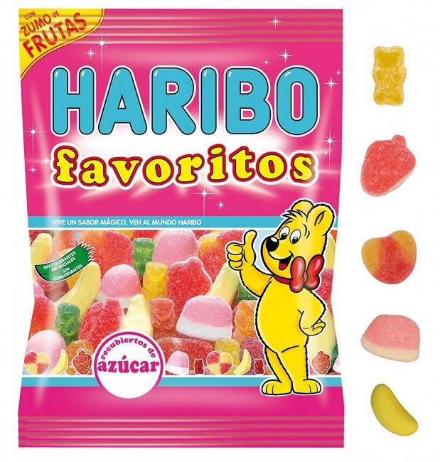 Saco de 90grs de gomas sortidas com acúcar com cerca de 3 cm que bananas, marshmallows, ursinhos e outros. Contém sumo de frutas.