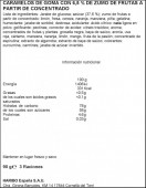 Ingredientes: xarope de glicose, açúcar, gelatina, dextrose, sumo de vários frutos obtidos a partir de um produto concentrado: maçã, morango, framboesa, laranja, limão, ananás; acidificanteácido citrico, concentrados de frutos e plantas: cártamo, espirulina, maçã, baga de sabugueiro, laranja, groselha-negra, kiwi, limão, arónia, manga, maracujá, uva,; aroma ; extracto de baga sabugueiro; agentes de revestimento: cera de abelhas (branca e amarela), cera de carnaúba.