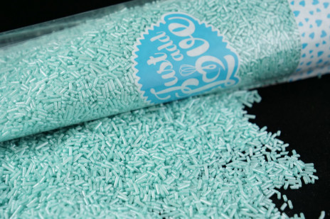 Embalagem de 250g com granulado em tom de azul bebé brilhante, para decoração de todo o tipo de bolos.