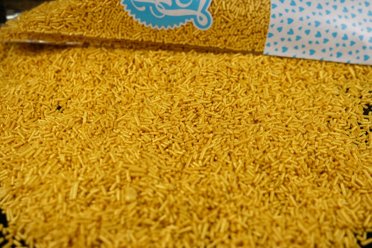 Embalagem de 250g com granulado na cor ouro brilhante, para decoração de todo o tipo de bolos.