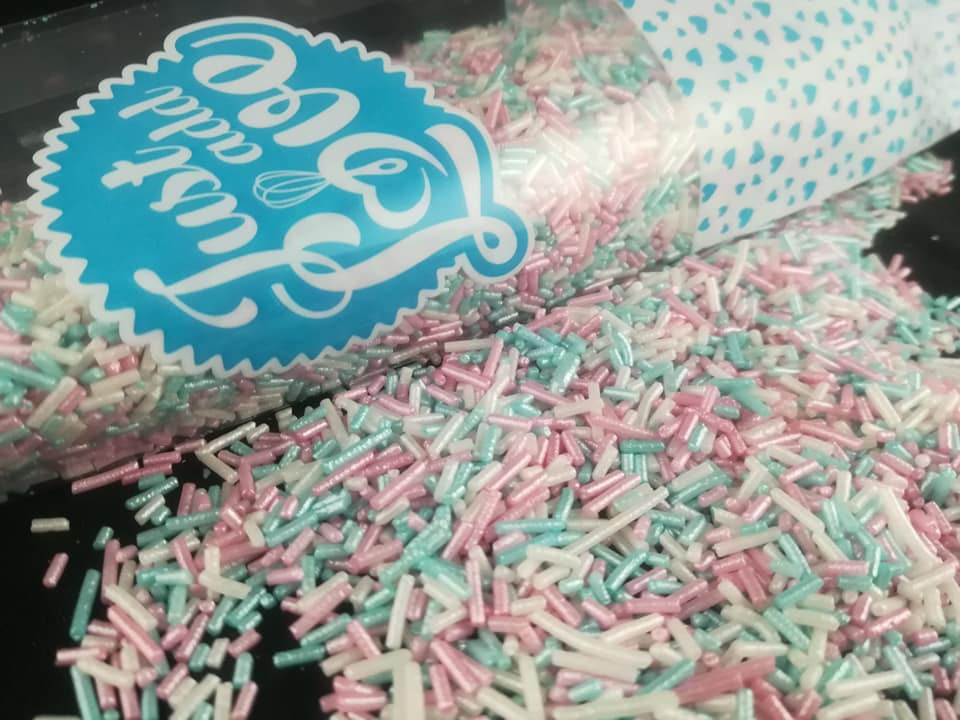 Embalagem de 250g com granulado em tons de branco, rosa e azul brilhante, para decoração de todo o tipo de bolos.