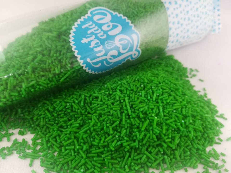 Embalagem de 250g com granulado em tom de verde, para decoração de todo o tipo de bolos