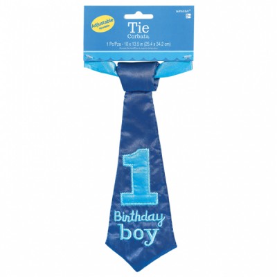 Gravata em cetim com bordado na descrição "1 Birthday Boy", ajustável ao pescoço da criança.