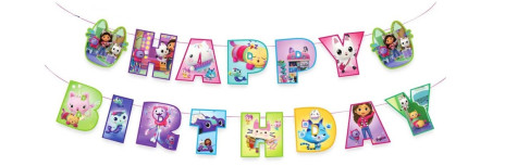 Faixa banner em cartão com a inscrição "Happy Birthday" da Gabby's Dollhouse. Decora a tua festa de aniversário com esta grinalda preparada com atilhos.