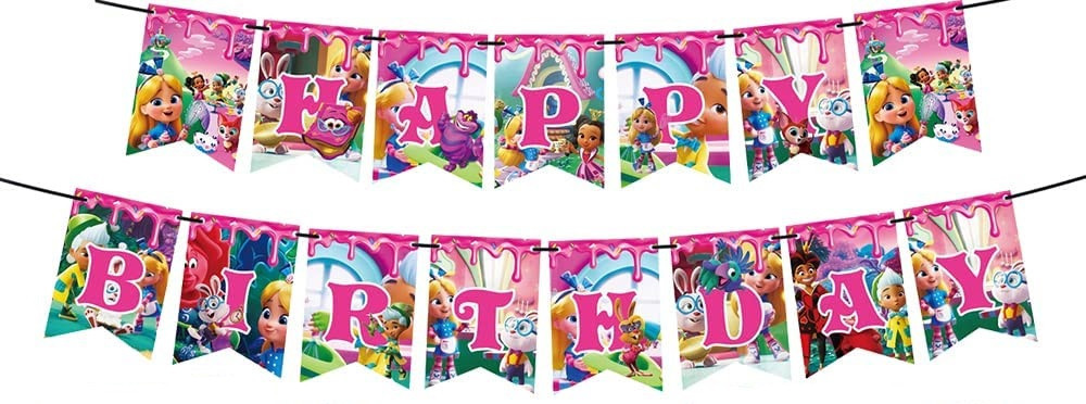 Faixa banner em cartão de Alice's Wonderland Bakery com a inscrição "Happy Birthday". Decora a tua festa de aniversário com esta grinalda preparada com atilhos.