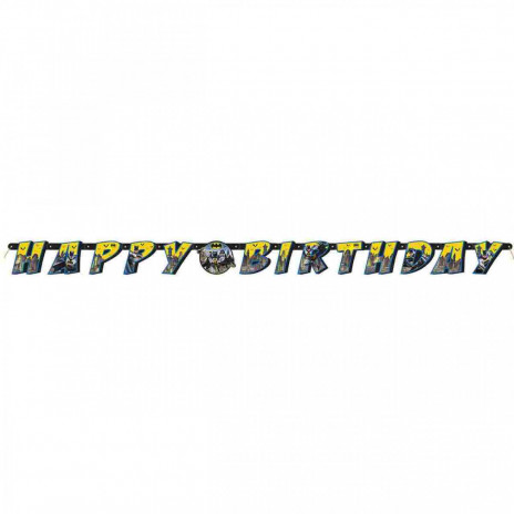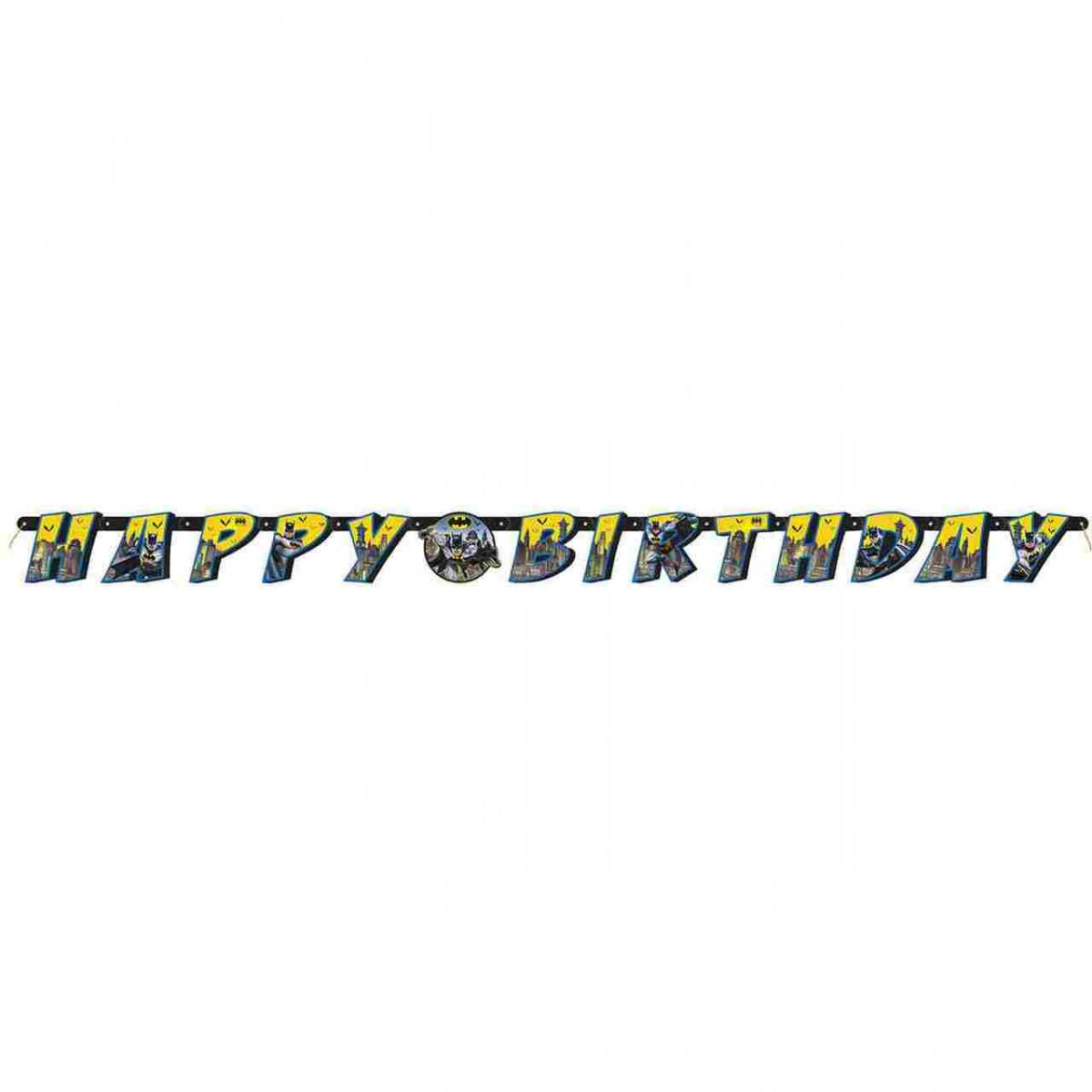 Faixa decorativa ou grinalda articulada do Batman da DC Comics para decoração da tua festa de aniversário com as letras que compõem a inscrição "Happy Birthday".