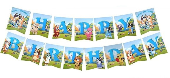 Faixa banner em cartão da Bluey com a inscrição "Happy Birthday". Decora a tua festa de aniversário com esta grinalda preparada com atilhos.