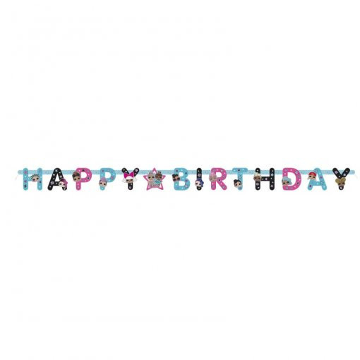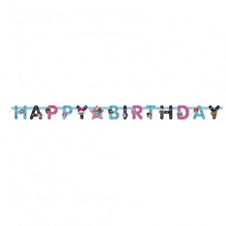 Faixa decorativa ou grinalda articulada das LOL Surprise para decoração da tua festa de aniversário com as letras que compõem a inscrição "Happy Birthday".