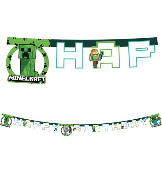 Faixa decorativa ou grinalda do Minecraft para decoração da festa de aniversário com as letras que compõem a inscrição "Happy Birthday".