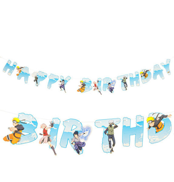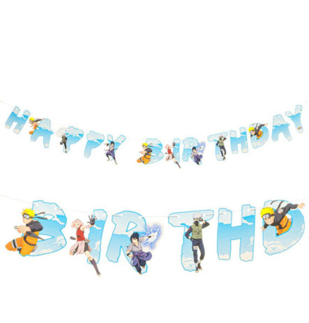 Faixa decorativa ou grinalda articulada do Naruto para decoração da tua festa de aniversário com as letras que compõem a inscrição "Happy Birthday".