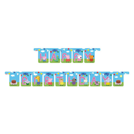 Faixa decorativa ou grinalda articulada da Porquinha Peppa para decoração da tua festa de aniversário com as letras que compõem a inscrição "Happy Birthday".