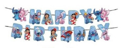 Faixa banner em cartão do Stitch e da Angel com a inscrição "Happy Birthday". Decora a tua festa de aniversário com esta grinalda preparada com atilhos.