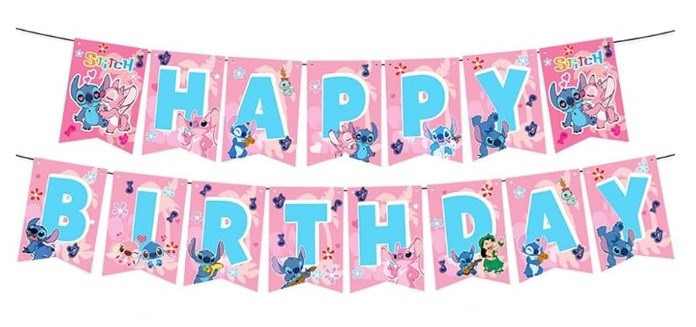 Faixa banner em cartão do Stitch com a inscrição "Happy Birthday". Decora a tua festa de aniversário com esta grinalda preparada com atilhos.