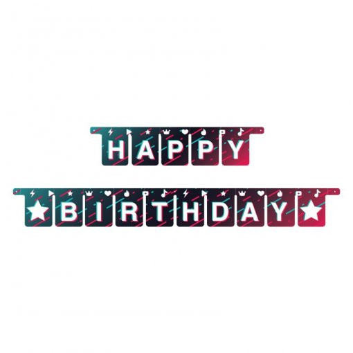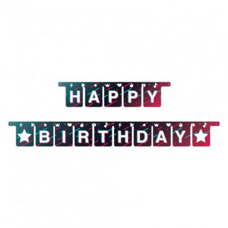 Faixa decorativa ou grinalda articulada do Tik Tok para decoração da tua festa de aniversário com as letras que compõem a inscrição "Happy Birthday".