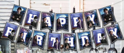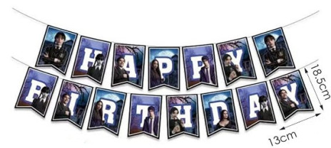 Faixa banner em cartão da série Wednesday com a inscrição "Happy Birthday". Decora a tua festa de aniversário com esta grinalda preparada com atilhos.