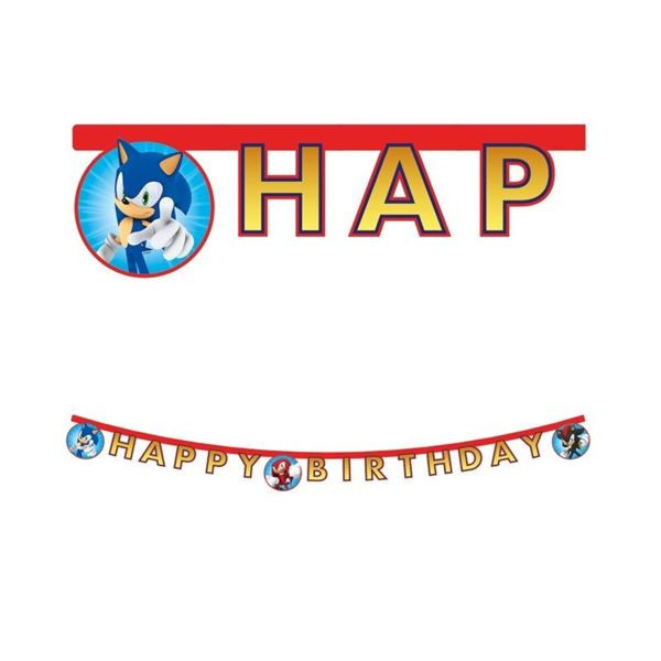 Faixa decorativa ou grinalda articulada do Sonic para decoração da tua festa de aniversário com as letras que compõem a inscrição "Happy Birthday".
