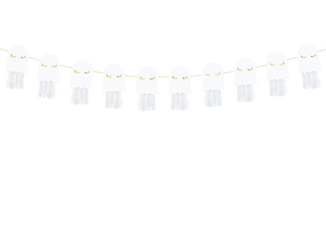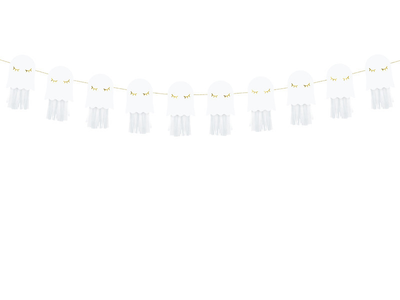 Para decoração da sua festa de halloween não pode faltar esta faixa com 10 fantasmas em papel. Com tudo o que é necessário para montar a grinalda.
