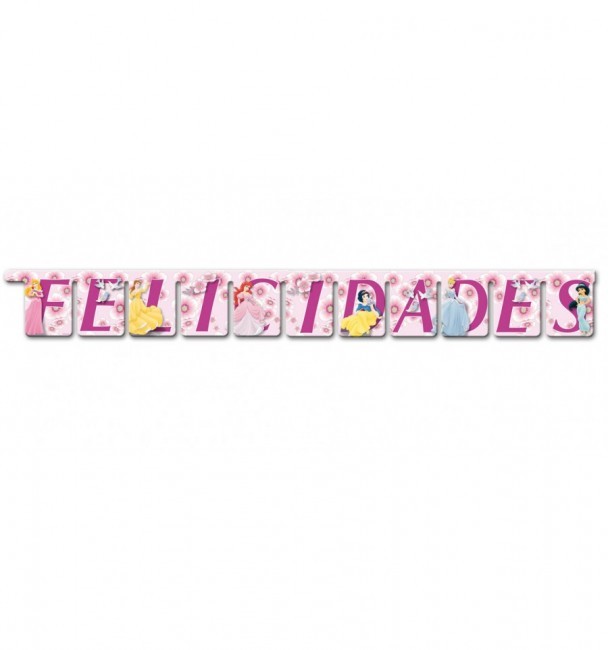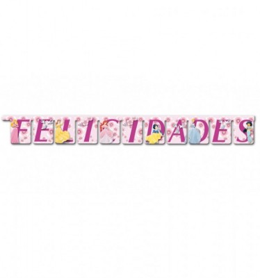Pendure esta linda grinalda, com a indicação de Felicidades, das Princesas da Disney num lugar bem destacado da festa de aniversário.