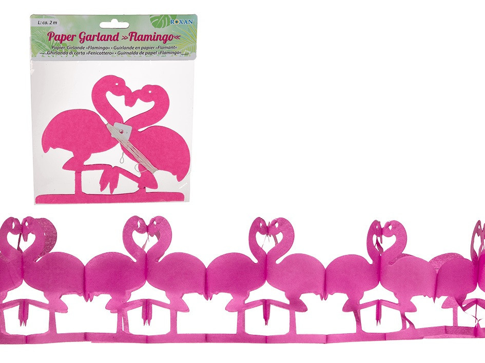 Grinalda de papel rosa muito engraçada composta por vários flamingos que darão alegria, luz e cor à sua festa ou evento.