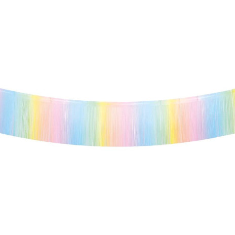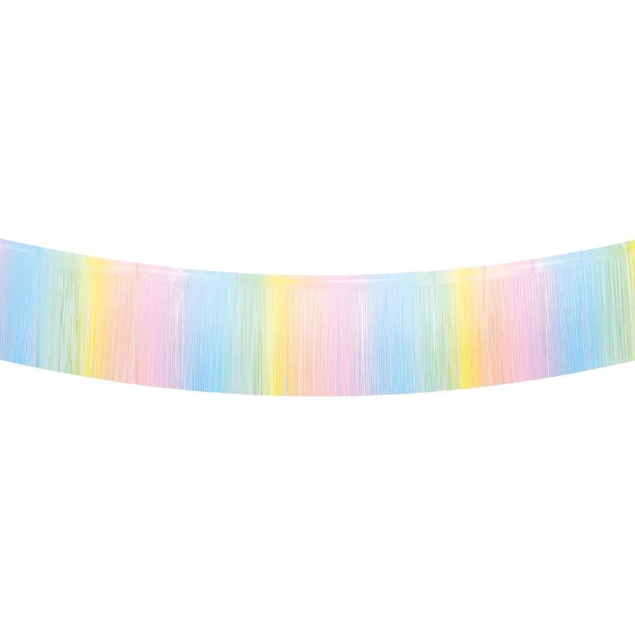Grinalda de franjas coloridas com 30cm de altura e 3 metros de comprimento com cores arco iris (rainbow) em tons pastel.