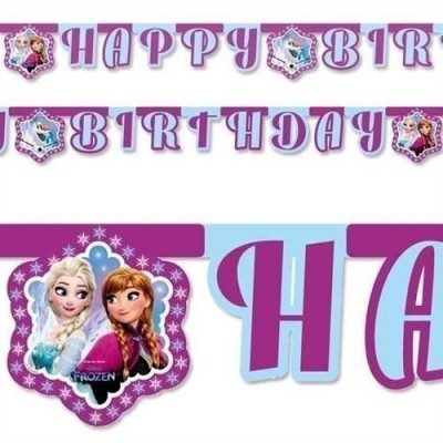 Grinalda com a inscrição \"Happy Birthday\" e imagens das irmãs Elsa e Anna do filme Disney Frozen. Comprimento: 2,15m.