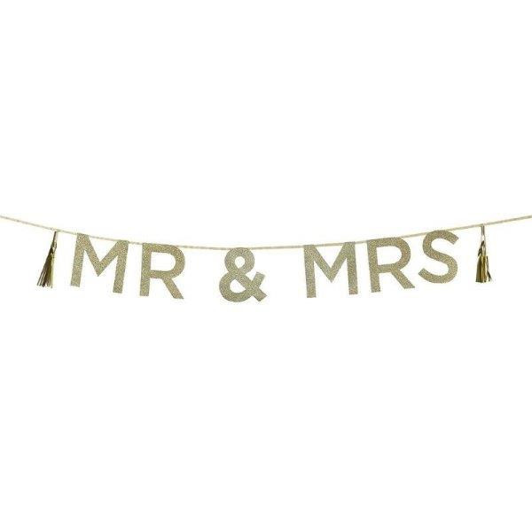 Grinalda para festa de casamento em cartão com glitter com letras MR&MRS. A grinalda tem 2 metros de comprimento.