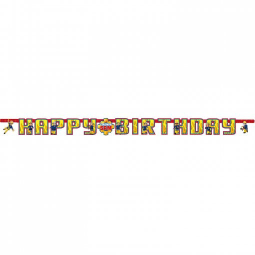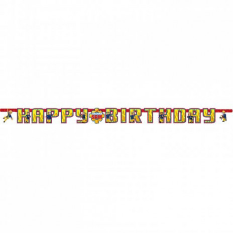 Faixa banner em cartão do Bombeiro Sam com a inscrição "Happy Birthday". Ideal para a decoração da tua festa de aniversário com o mesmo tema.