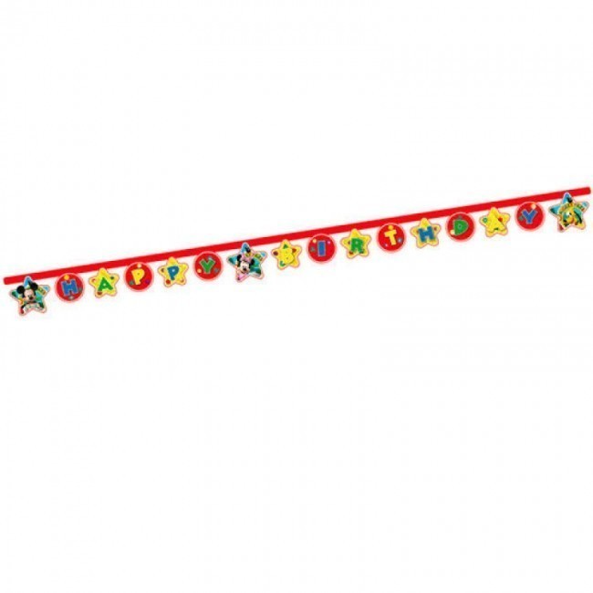 Grinalda para a festa de aniversário Mickey Mouse Disney com a inscrição "Happy Birthday".