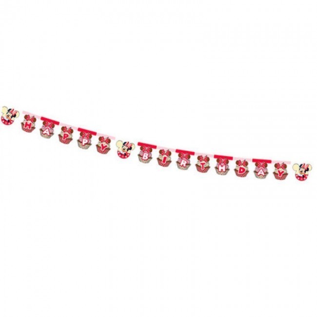 Grinalda para a festa de aniversário Minnie Mouse Disney com a inscrição "Happy Birthday".