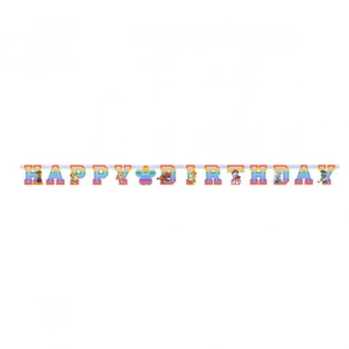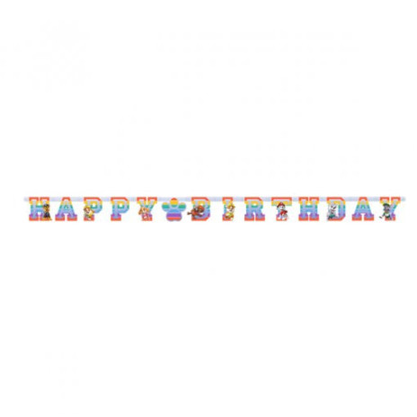 Faixa banner em cartão da Paw Patrol com a inscrição "Happy Birthday". Ideal para a decoração da tua festa de aniversário com o mesmo tema.