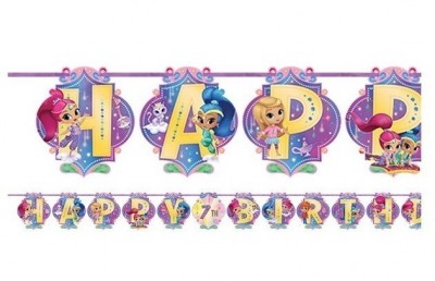 Mega faixa decorativa da Shimmer e Shine com personalização do número de aniversário no centro.Dimensão: 3,2 metros x 25,4 cmContém também 5 fitas adesivas duplos e corda para pendurar.