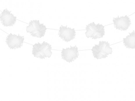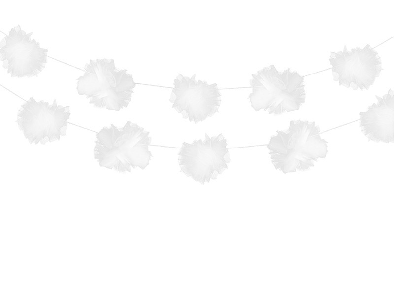 Grinalda em tule branco em forma de pompom para decoração de festas e eventos. Pode também ser usada para decoração de carros em casamentos e batizados.