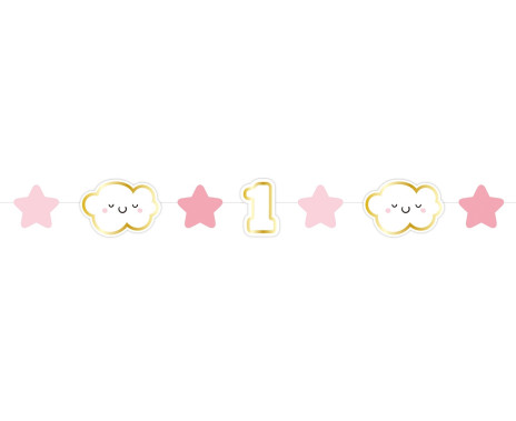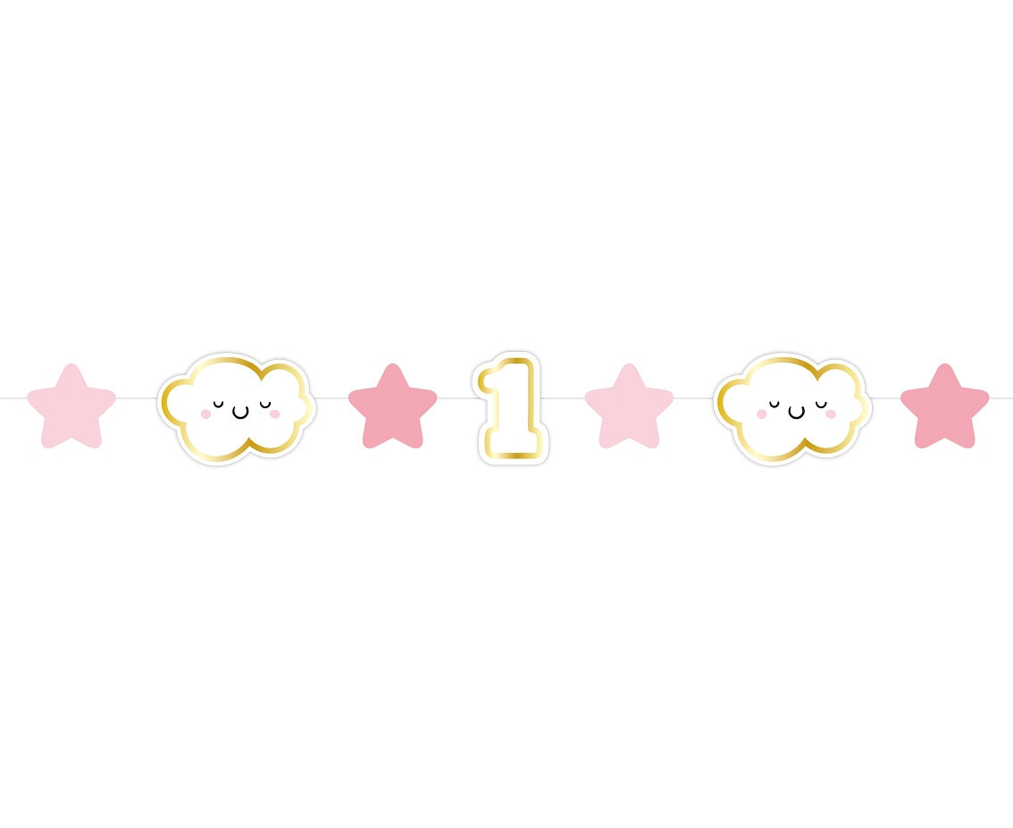 Para decoração da festa de aniversário do primeiro aniversário da sua bebé, uma grinalda de nuvem em cor de rosa com o número um.