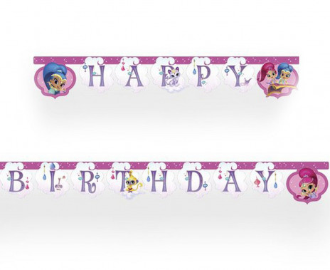 Faixa banner em cartão da Shimmer and Shine com a inscrição «Happy Birthday» e 2 metros de comprimento.Decora a tua festa de aniversário com esta grinalda preparada com atilhos.
