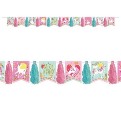 Grinalda com pompons e glitter para decoração de festas sob o tema Unicórinios.