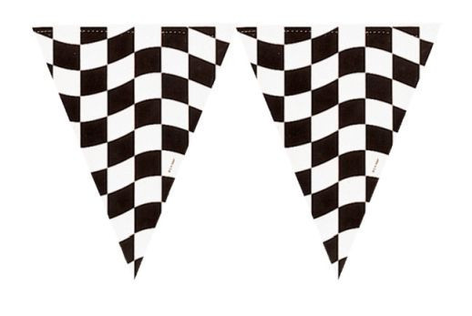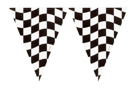 Bandeirolas de plástico para festa de aniversário com tema corrida. Inclui uma grinalda com bandeiras com padrão xadrez preto e branco.