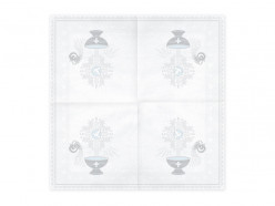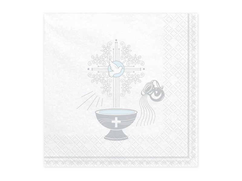 Pack de 20 guardanapos de papel para batizados em branco com estampa em prateado e azul.