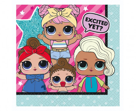 Conjunto de dezasseis guardanapos de folha dupla com as bonequinhas da série LOL Surprise.