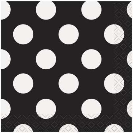 Pack de 16 guardanapos pequenos de folha dupla na cor preta com bolinhas brancas.