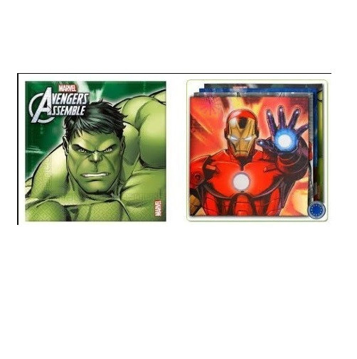 Guardanapos de folha dupla para as festas de aniversário com o tema Avengers Power Marvel, com imagem do Hulk e do Iron Man