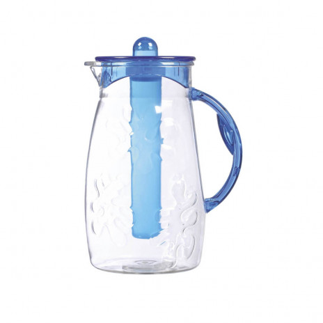 Jarro plástico com Tubo para Gelo Azul. A parte azul retira se e enche se com agua , coloca se no congelador. Após congelado, coloca de no interior do jarro, deixando a bebida sempre fresca, sem misturar os liquidos.