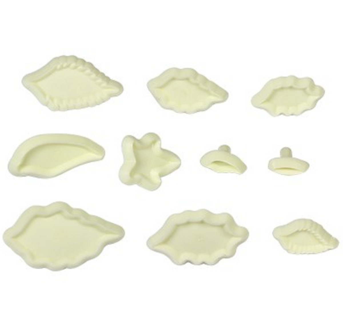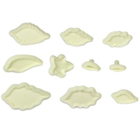O conjunto inclui 10 cortadores de folhas que podem criar várias folhas diferentes para flores, incluindo hera, azevinho, folhas simples e pontiagudas.