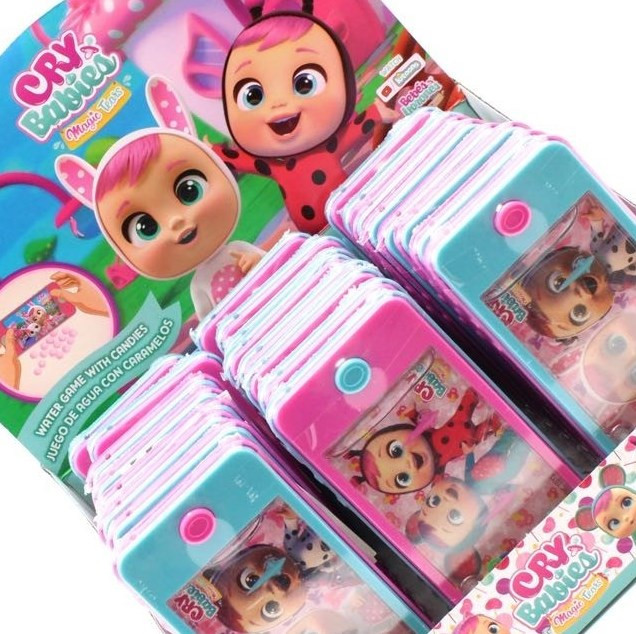 Jogo de água Cry Babies sortido com 2 imagens e um pacotinhos de doces de 3gr. nas costas. Ideal para brinde de festas de aniversário Cry Babies.